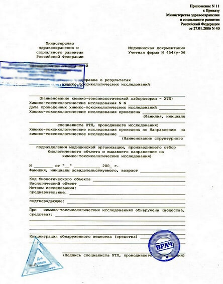 Справка формы 454/у-06 (ХТИ) — это официальный медицинский документ о результатах химико-токсикологического исследования на наличие наркотических веществ. Требуется при трудоустройстве на режимные объекты, получении лицензии на оружие, оформлении водительских прав.