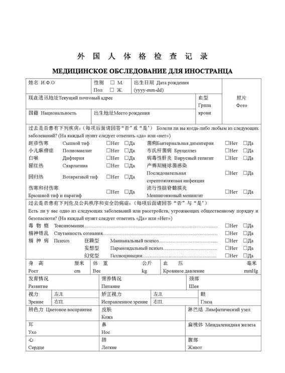 Для оформления медицинской справки на визу в Китай необходимо сдать анализ крови на ВИЧ, сифилис, гепатиты В и С, сделать флюорографию, ЭКГ и пройти осмотр терапевта. Все исследования должны быть проведены в сертифицированном медицинском центре.