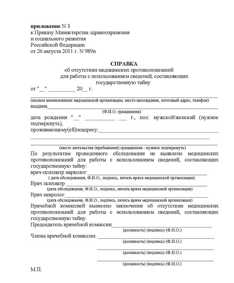 Справка оформляется в соответствии с требованиями приказа Минздрава России №989н и является обязательной для сотрудников, имеющих доступ к сведениям особой важности. Включает результаты обследований, подтверждающих психическое здоровье и отсутствие наркологических заболеваний.